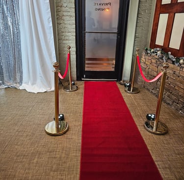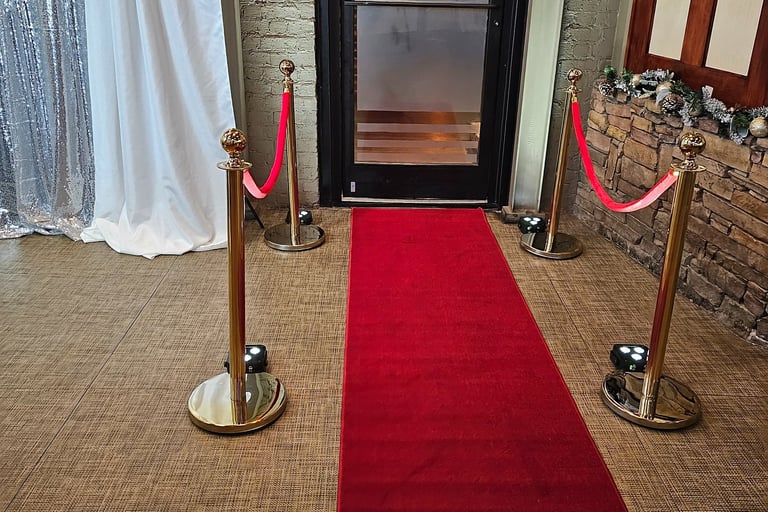 Includes 1 Large Red Carpet (10ft x 3 ft) and 4 Gold Stanchion with 2 Red Ropes - $75.